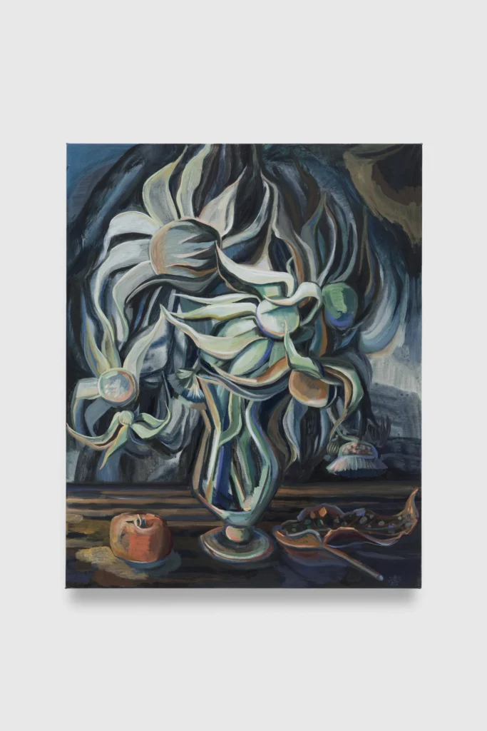 Deeply connected to nature and plant life, a bond rooted in her upbringing on the wide plains of eastern Montana, Bedford’s floral paintings challenge genre conventions, offering a feminist narrative that emphasizes cycles of birth, death, and rebirth. By incorporating extinct and uncanny flora, she highlights life’s fragility and evokes both remnants of a lost world and the possibilities of unknown futures.