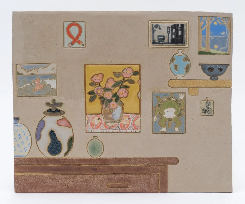 In Before Lunch, McNamee-Tweed presents an array of wall-hanging ceramics that examine themes of self-mythology, the animacy of the natural world, and contemporary expressions of spirituality. Some pieces depict richly detailed interior spaces, where walls are adorned with drawings, notes, and grocery lists, and tables are scattered with books, tools, pots, and artworks. These interiors are simultaneously lived-in and symbolic, serving as intimate repositories for memory, creativity, and the quiet rituals of everyday life.