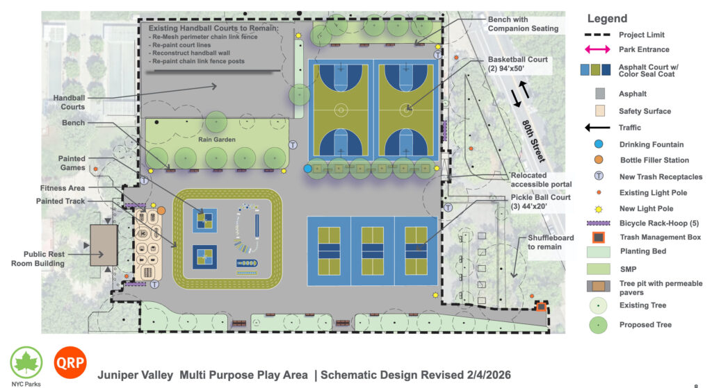 final version. The softball field has been eliminated. A super large rain garden will serve as a buffer between the main space and the upgraded handball courts. Two basketball courts are in the northeast corner of the blacktop and three pickleball courts with removable nets are in the southeast corner. The rest of the space is dedicated to a painted track and games. This allows the area to be used for concerts and other events. We understand that the electricity will be upgraded as well, so that the portable stage can be connected, eliminating the need for generators.