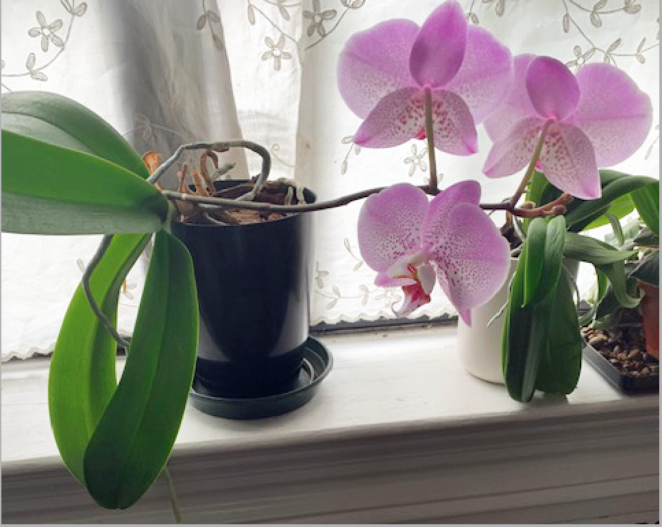 Alongside the African violet stands a second potted plant with three pale purple orchids. Usually, the flowers would appear in a vertical cluster, but instead these florets grew in a horizontal direction, as though to offer its friendship and in conversation with the small African violet posies. This windowsill has yet a third plant. A small orchid plant stands proudly boasting a mass of white and purple blossoms twice a year. The plant was a gift on my eightieth birthday, making it almost fifteen years old and still thriving.