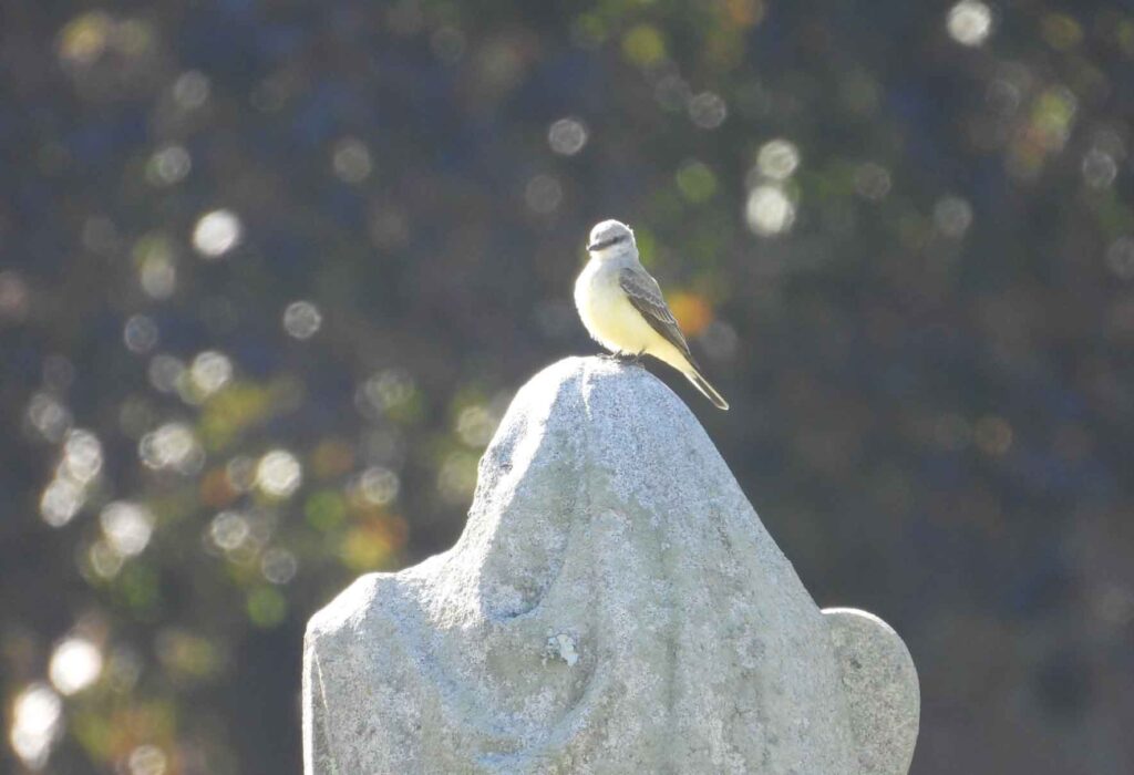 A rare visitor to these parts caused some excitement recently. A Western Kingbird showed up at All Faiths Cemetery in mid-October. The name “kingbird” was bestowed upon the species due to the bird’s aggressiveness. Kingbirds are known to defend their territory and will even go after hawks that get too close. Their typical feeding behavior is to wait on open perches, such as gravestones, and fly out to catch insects. This bird is believed to have moved on after a few days to a warmer climate. Photo by Andrew Greller