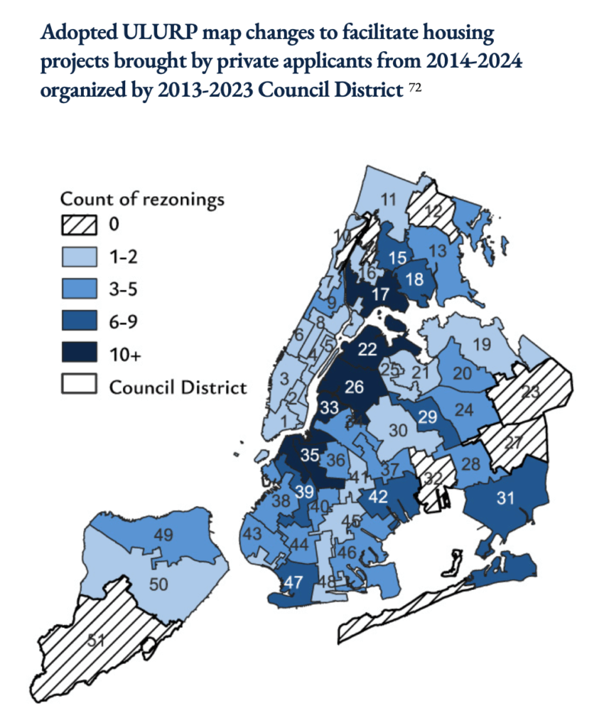 “In medium- and high-density areas (zoned R6 and above), ELURP would enable a type of gentle increase in density that ULURP effectively prohibits. Specifically, zoning map changes that result in an increase in standard residential capacity of 30% or less would be eligible for ELURP.”