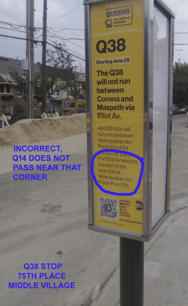 Replacing the upper half of the Q38 with the Q14 is a mistake, especially with no easy transfer point. In my September report, I referred to the incorrect Bus Stop signs claiming you can transfer at Metropolitan and Fresh Pond. The only change I have seen is that the incorrect signs have been replaced with generic ones not even mentioning the Q14. Ideally full resumption of the old Q38 Route is the best solution; at a minimum a single point Transfer between the two lines is needed.