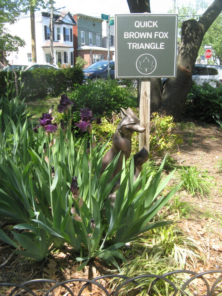 Now, how did my little park get to be called “Quick Brown Fox Park?” The Parks Commissioner at the time was Henry Stern and he gave himself and his staff whimsical nicknames and this carried over to park names. The saying “The quick brown fox jumped over the lazy dog” is known as a pangram because it uses all the letters in the alphabet and has been used to teach reading, writing, typing, and talking in English. There was originally a sign in the park with all this information, but it has long been gone. It’s a good thing the fox statue has been well cemented in as I’m sure there have been attempts to steal it. An interesting note: for the last 15 years or so kids haven’t been hanging out there anymore. I enjoy the quiet peacefulness and don’t miss the drama, but I wonder just what are the teens doing these days?