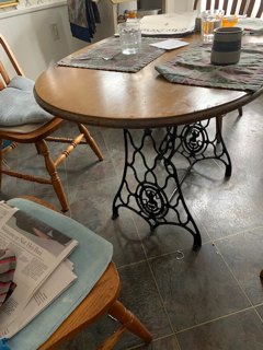 I view the shiny black ornate cast iron support of this table and I am also looking at what once had been the metal of Momma’s Singer treadle sewing machine. I am looking at the base of that sewing apparatus which played such an important role in her daily life and an important role in my wardrobe. Viewing this reconnects me with fond memories of Momma. I see her foot pushing the treadle up and down. I hear the treadle going BANG, BANG, BANG!!!