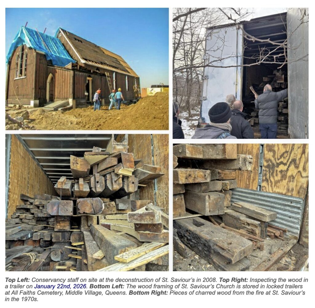Late last year, the trailer locks were removed without the knowledge or consent of JPCA or NHS. QNS/Ridgewood Times newspaper reporter Patrick Stachniak then wrote an exposé about the condition of the church. The title of the report was, “FORSAKEN: Why is St. Saviour’s Church, a dismantled Maspeth landmark, rotting away in a Middle Village cemetery?” Patrick also falsely claimed on his social media that we had “thrown it away” and lamented the fact that we refused to participate in his disingenuous attempt at journalism. The article was wildly inaccurate and accusatory. Maureen Walthers, the late, great former owner and publisher of the Ridgewood Times, who started as a civic activist and co-founder of Greater Ridgewood Historical Society, is surely rolling over in her grave over what’s become of this once amazing community newspaper. The only things this accomplished were attracting unwanted attention to where the church is stored, and harming funding efforts.