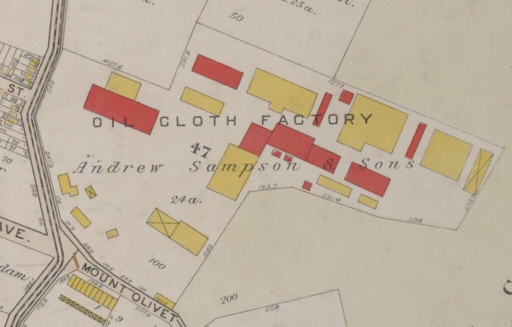 Sampson’s Oil Cloth Factory, on Mt. Olivet Avenue (59th Drive) and Fresh Pond Road was quite a large operation. In fact, in 1882, it was Maspeth’s largest manufacturer and employer and the largest manufacturer of oil cloth in the world. A great percentage of the employees were Polish, and the company built houses for them on Mt. Olivet Avenue.
