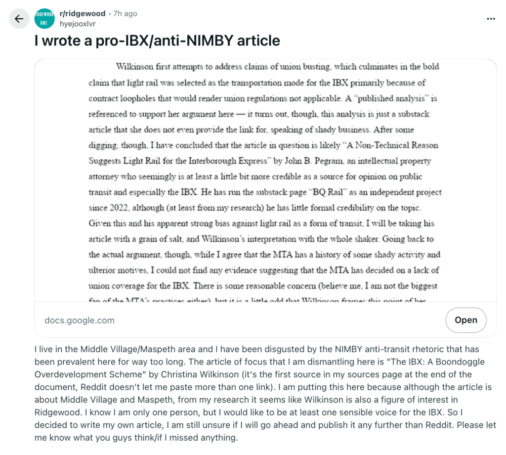 The first paragraph of your linked op-ed claims I lied in my own op-ed above about the MTA’s willingness to host meetings in Maspeth and Middle Village. You seem to be quite ignorant of the actual timeline. The people of this community had been asking for an open house for more than a year via our assembly representative, Stephen Raga. Back in June, I confronted the IBX reps at a meeting when they presented at a Ridgewood non-profit. I asked why they kept having open houses in Jackson Heights and Ridgewood, but not in our neighborhoods, when we will have 3 IBX stops placed here. They assured me that open houses would continue in the fall. We heard nothing from them for months after, then we were asked to join a “community council” meeting which was by invite only, last month. They had no answers to any questions. Less than 2 weeks later, they convened a second community council to tell us they were moving forward with scoping sessions. They finally scheduled a Middle Village Q&A open house to take place AFTER the scoping session. Seems a little backwards, no?