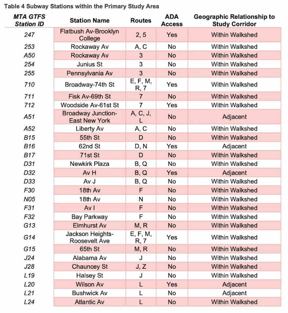“Within Walkshed” means the subway station falls within a half-mile walking distance from the study corridor. Stations listed as “Within Walkshed” are not close enough to the study corridor to support a direct transfer connection to new rail passenger service…
