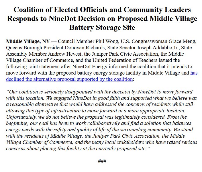Elected Officials, UFT, and Community Leaders Issue Joint Statement Opposing Proposed BESS Facility on 69th Place in Middle Village